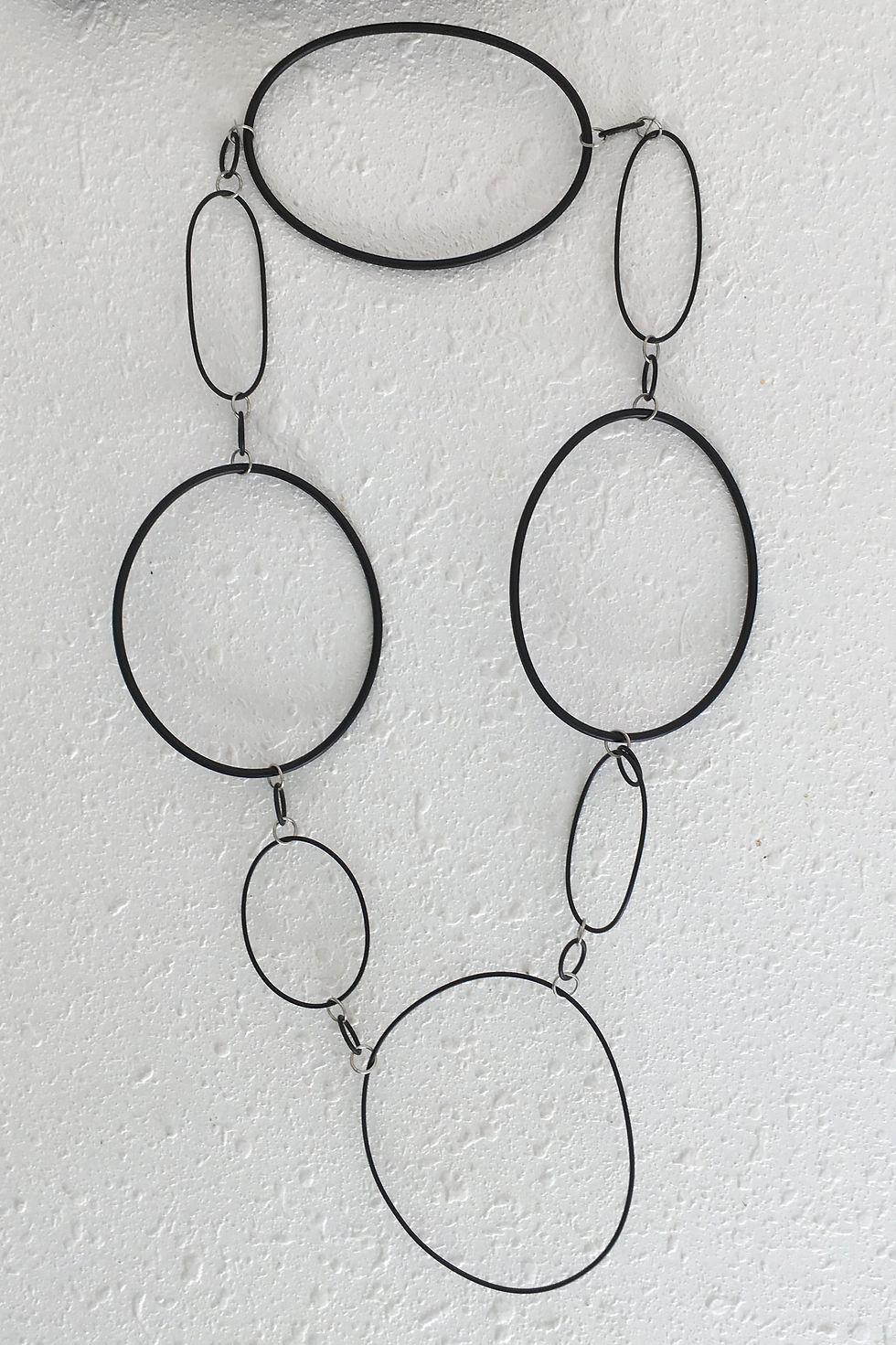 It pains me greatly, but every so often we lose track of an artist and such is the case here. I don't have a record of the artist's name, no business card and the studio name is too generic to trace. Thus we are offering some lovely, quirky, well crafted mystery jewelry. Some of the work is sterling silver, some is slinkys and rubber o-rings. Fun! And mysterious!